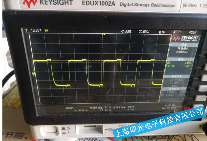 IGBT驅動波形如上圖,從示波器上可以看到頻率為19.336KHZ,交流值為13.2V,大部分的驅動波形都如上圖所示,也有各別的驅動波形不一樣,如滬通大力神的和步威的機器。