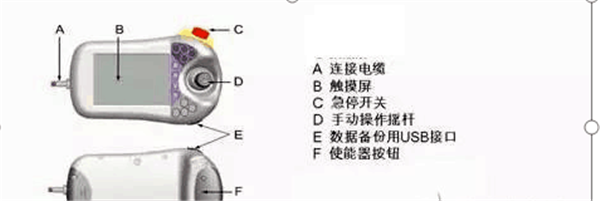 上圖是ABB機(jī)器人示教器,其中A是示教器與控制柜之間的連接電纜,B是觸摸屏,C是急停開關(guān),D是手動(dòng)操縱桿,E是數(shù)據(jù)備份與恢復(fù)用USB接口(可插U盤/移動(dòng)硬盤等存儲(chǔ)設(shè)備),F(xiàn)是使能按鈕。