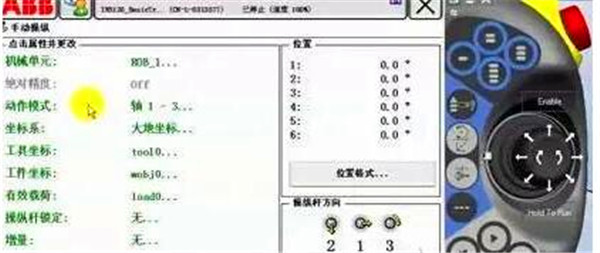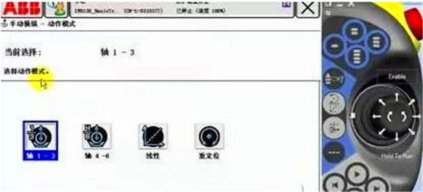 動(dòng)作模式中,選擇軸1-3。按下使能器到第一檔,手動(dòng)操縱桿左右方向可以控制Axis1運(yùn)動(dòng),上下方向控制Axis2運(yùn)動(dòng),旋轉(zhuǎn)操縱桿控制Axis3運(yùn)動(dòng)。