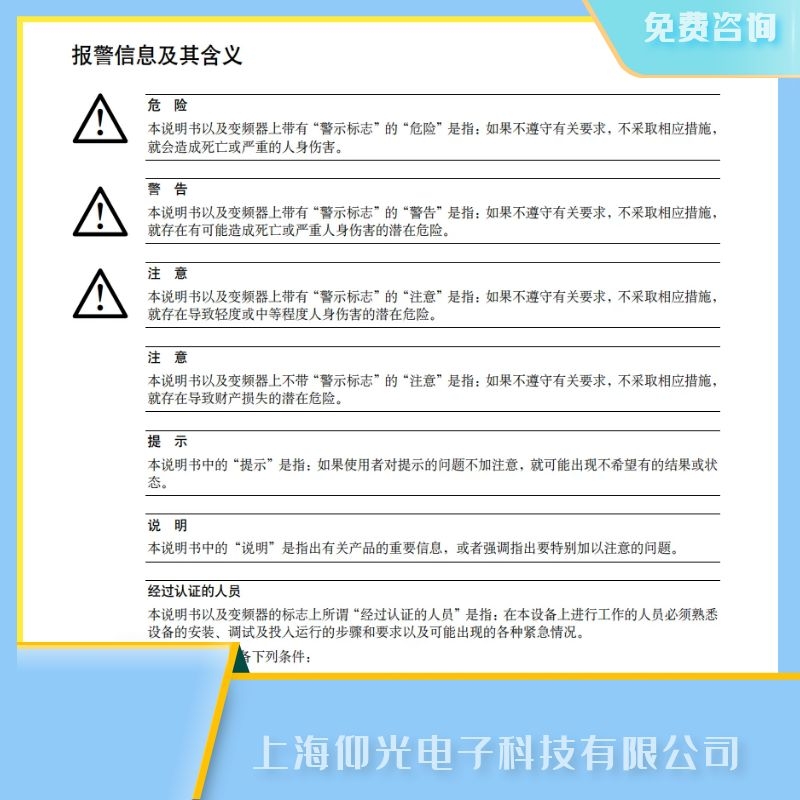 本說(shuō)明書(shū)以及變頻器上帶有“警示標(biāo)志”的“警告”是指:如果不遵守有關(guān)要求,不采取相應(yīng)措施,